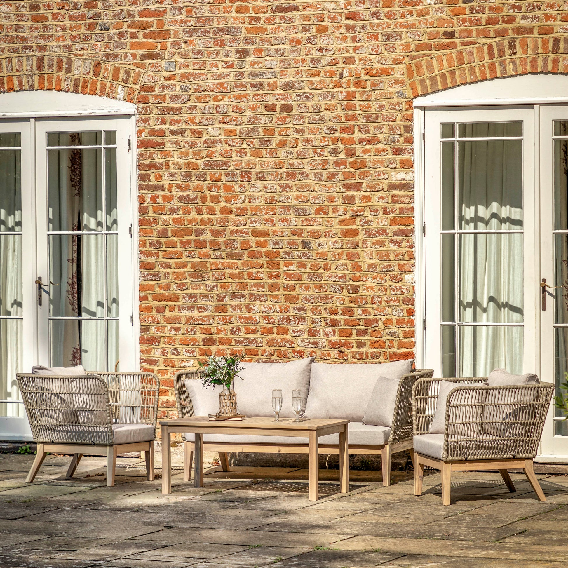 Give your outdoor space an update with this comfortable and stylish lounge set. With 2 armchairs and 2 seater sofa featuring eye catching woven rope detail arms and seat backs in natural the set is completed with a stylish slatted top coffee table. All made with FSC Acacia wood and UKFR foam cushions for extra comfort.