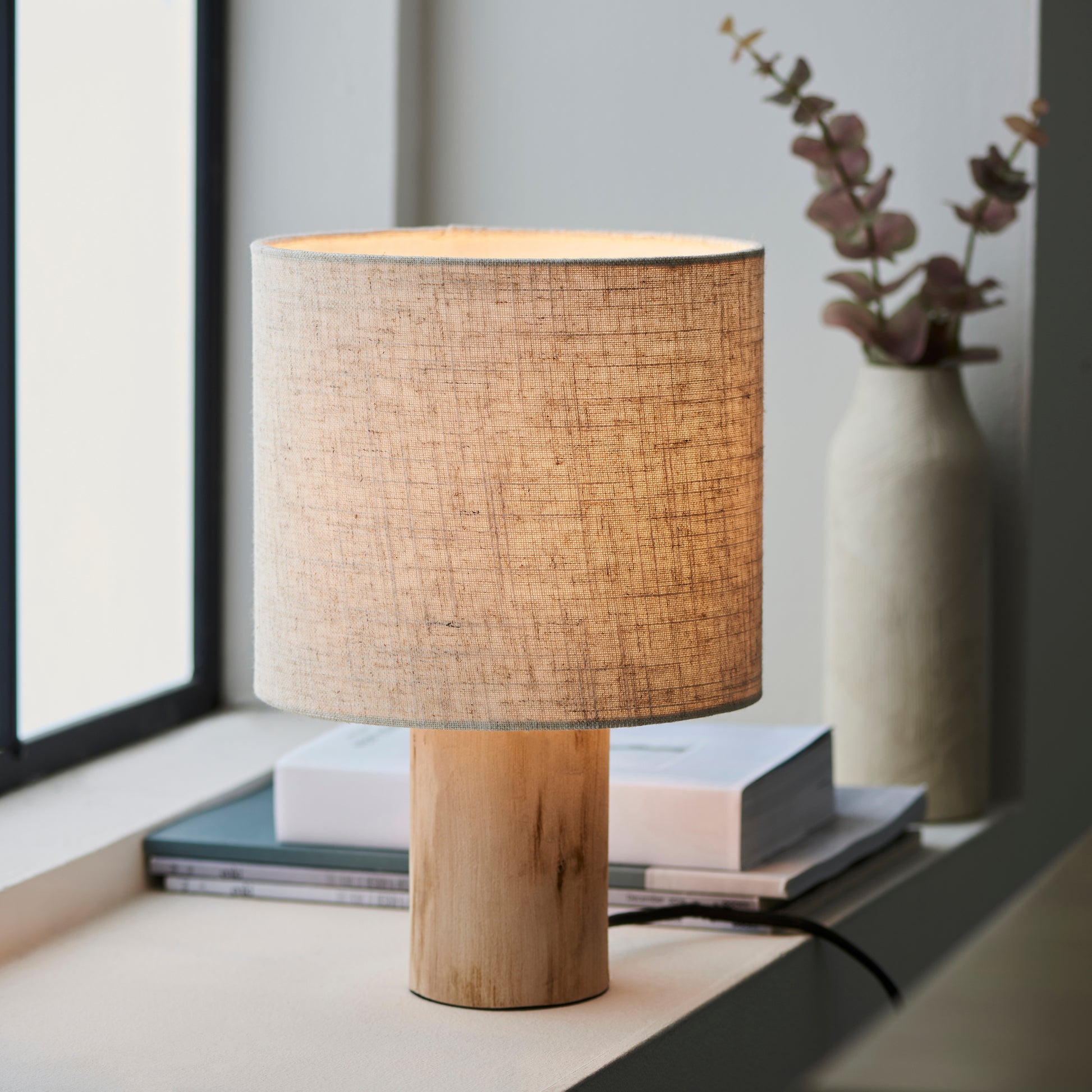 Embodying the natural cosy and minimalist characteristics of scandi design table light emits a warming glow through its natural linen shade. Natural wood base compliments in perfectly creating the ideal bedside table.