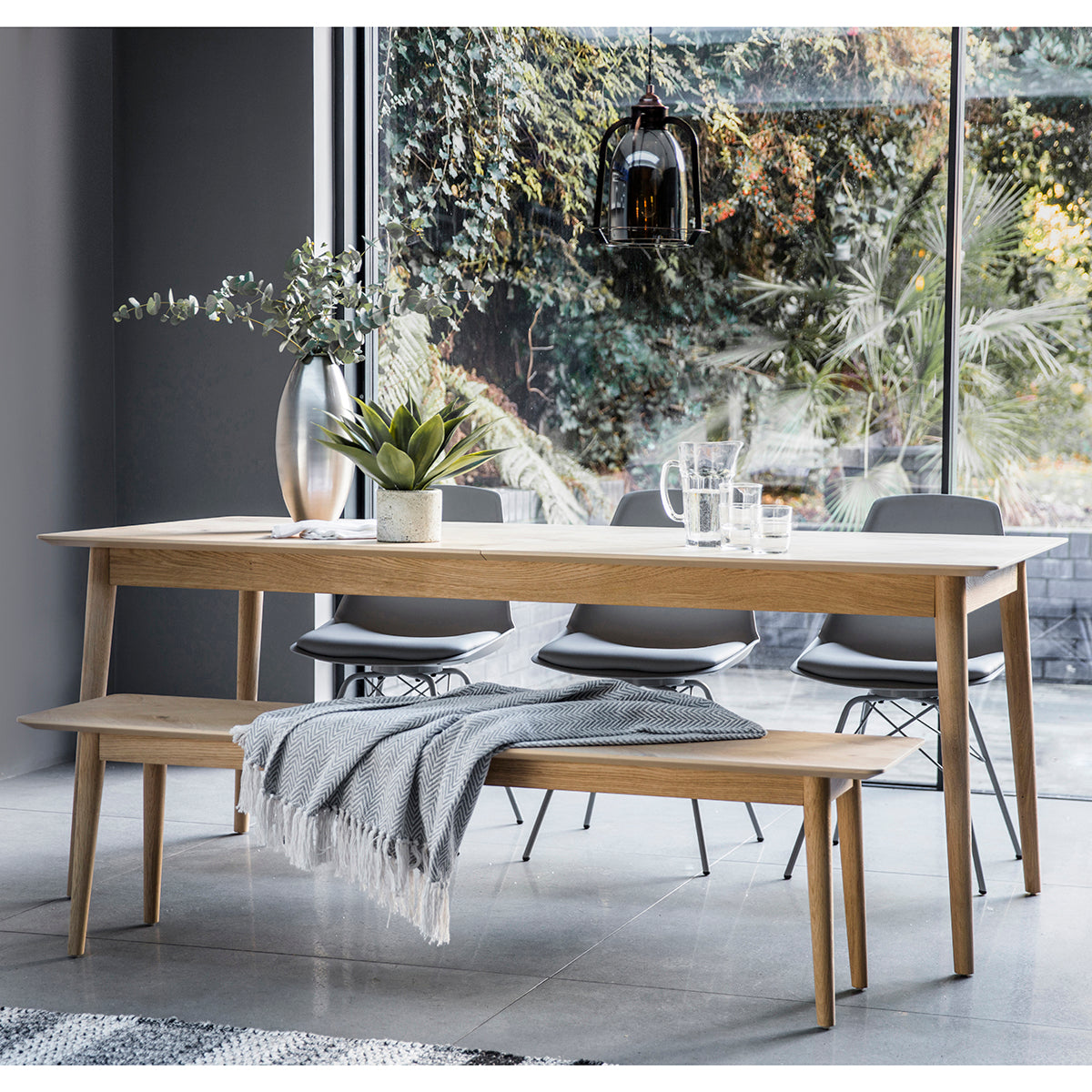 This stunning extending dining table features a beautiful inlay chevron design, and is made using European oak and rustic oak structured veneers which show the natural beauty of the oak grain and knots. Finished in a specialist mat lacquer, which keeps the timber looking natural and dry, with brushed out grain, the table is tactile to touch and looks amazing. W 2000-2520